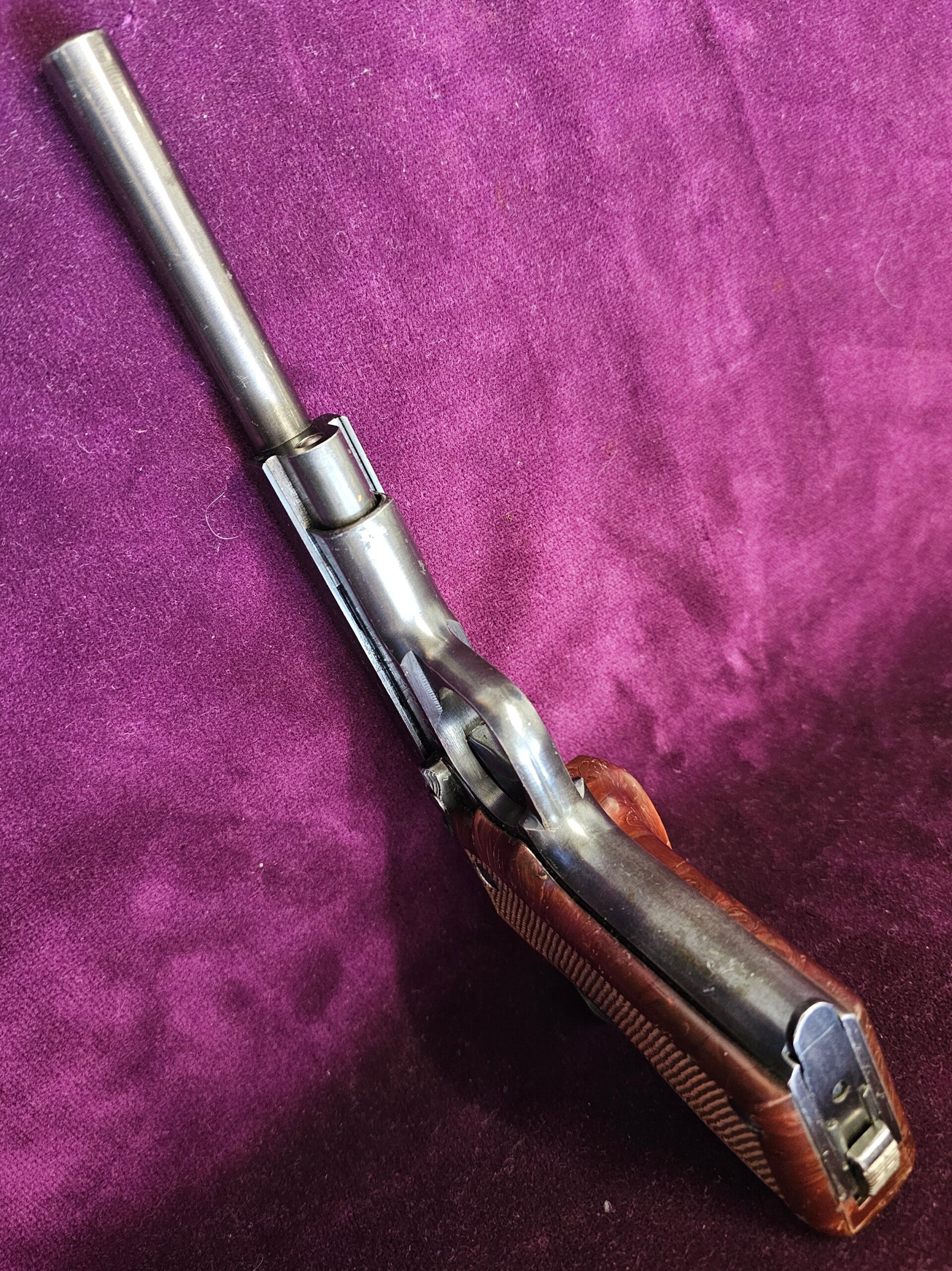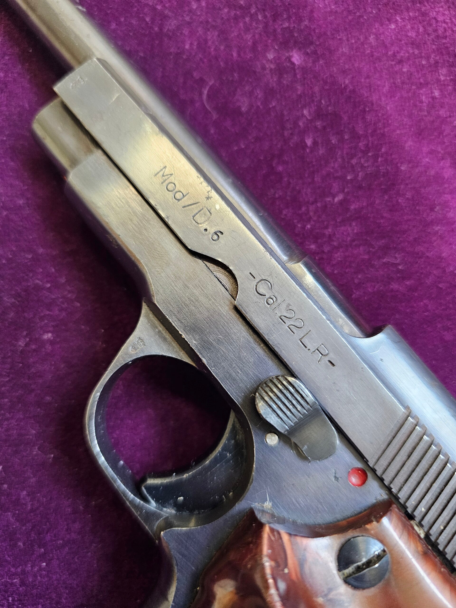 Joli UNIQUE D6 en calibre .22 LR, idéal pour de tir loisir ("plinking") et l'initiation grâce au coût réduit en munitions et à sa douceur de fonctionnement. Exemplaire provenant des années 1970 ; belle finition générale et canon en très bel état (15 cm) offrant une longueur totale de 23,5 cm
