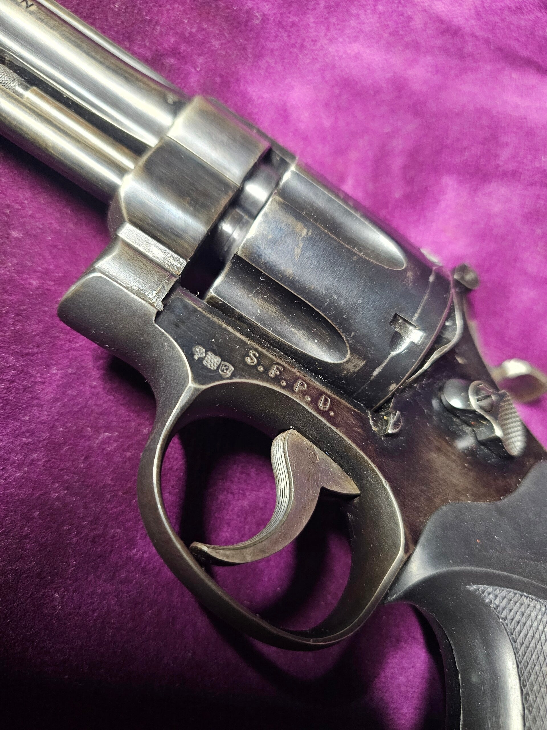 Le marquage externe “S.F.P.D.” atteste d’une dotation au San Francisco Police Department, ajoutant une dimension historique particulièrement recherchée.